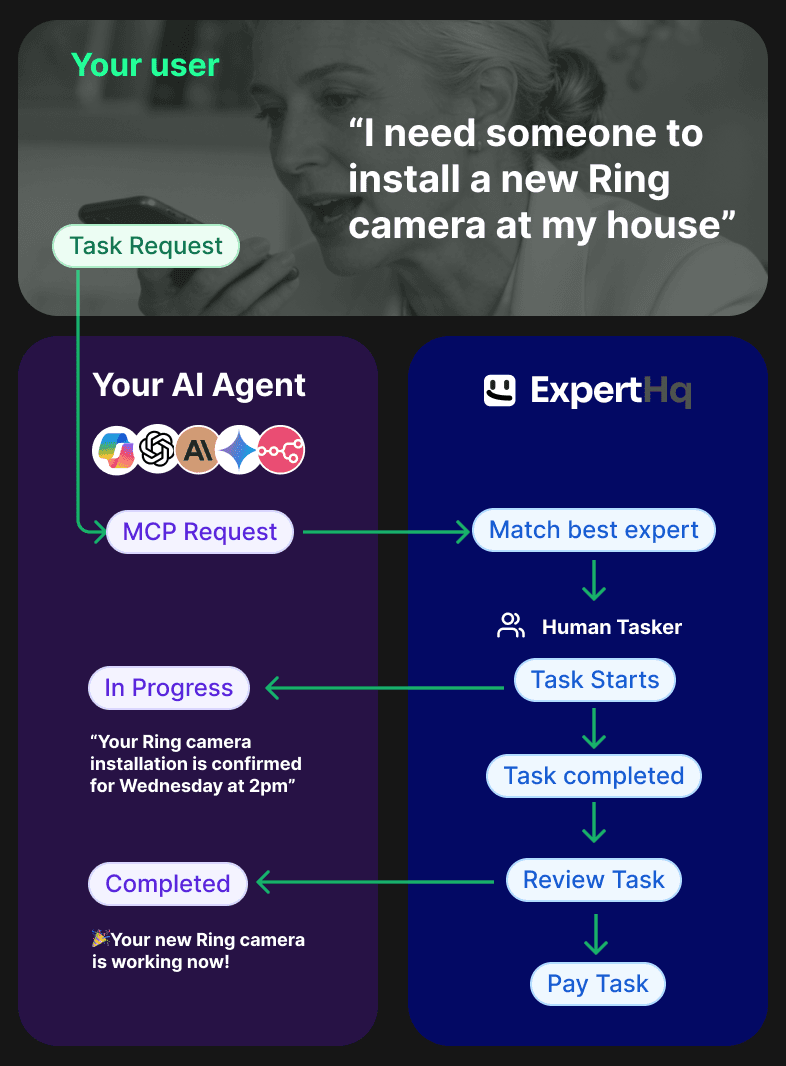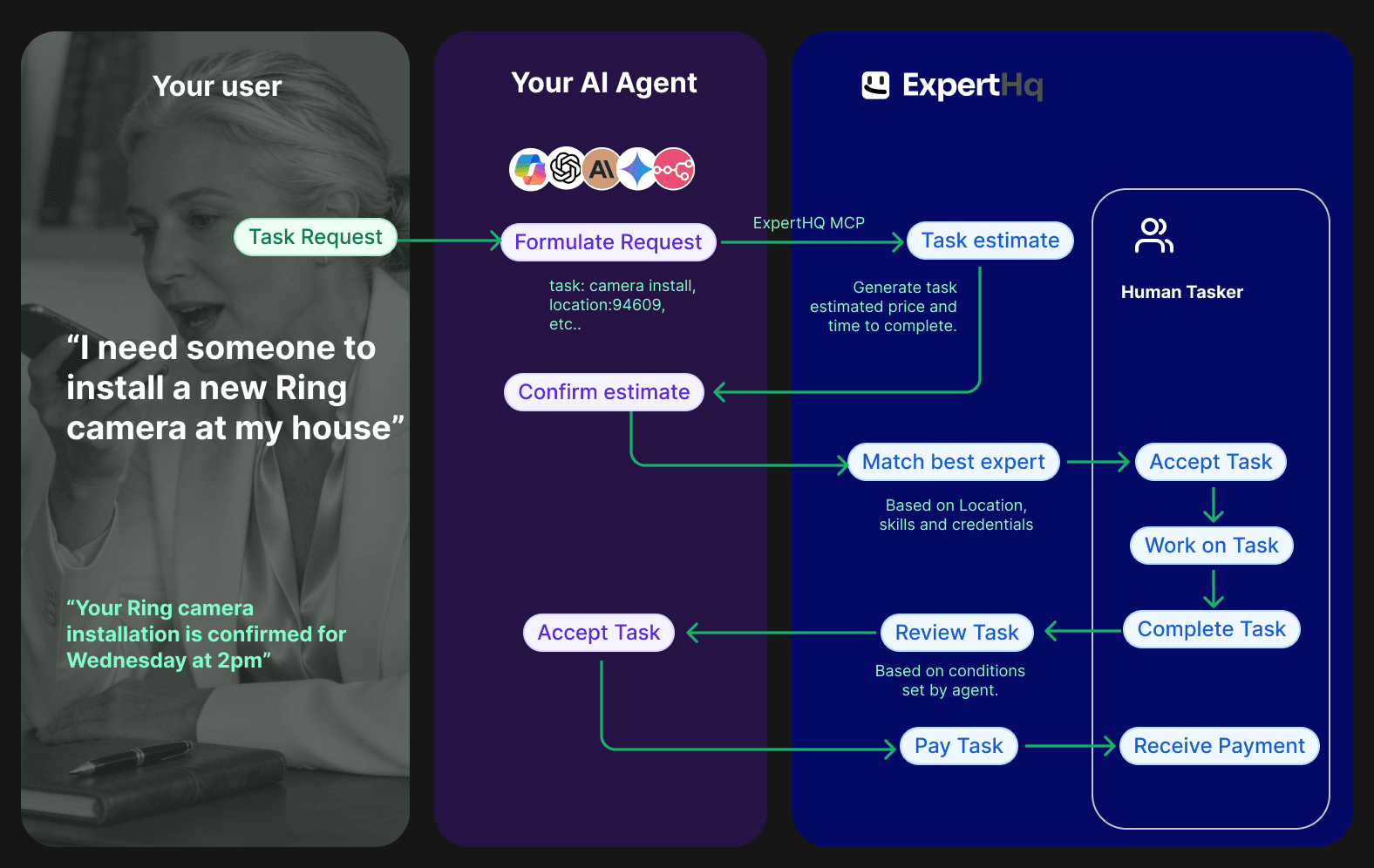 Our goal is to set up things once and let your agents do their magic. Using our MCP/API your agent can locate, hire, pay and evaluate human tasks